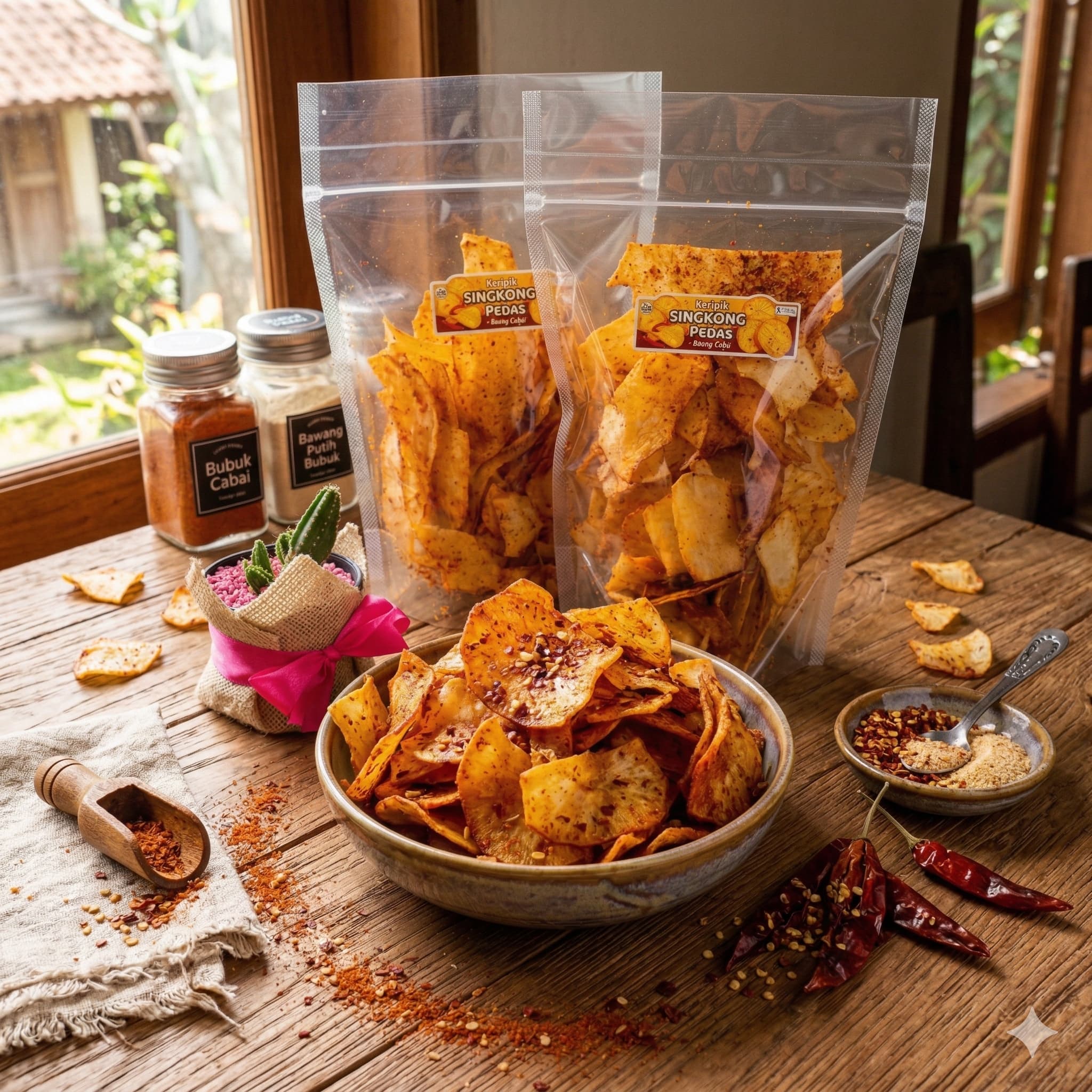 Kami tidak menggunakan mesin otomatis besar. Di Warung Mang Udju, setiap keping keripik dipilih manual, digoreng dalam batch kecil untuk menjaga kualitas suhu minyak, dan dibumbui dengan rempah segar pasar Lembang.