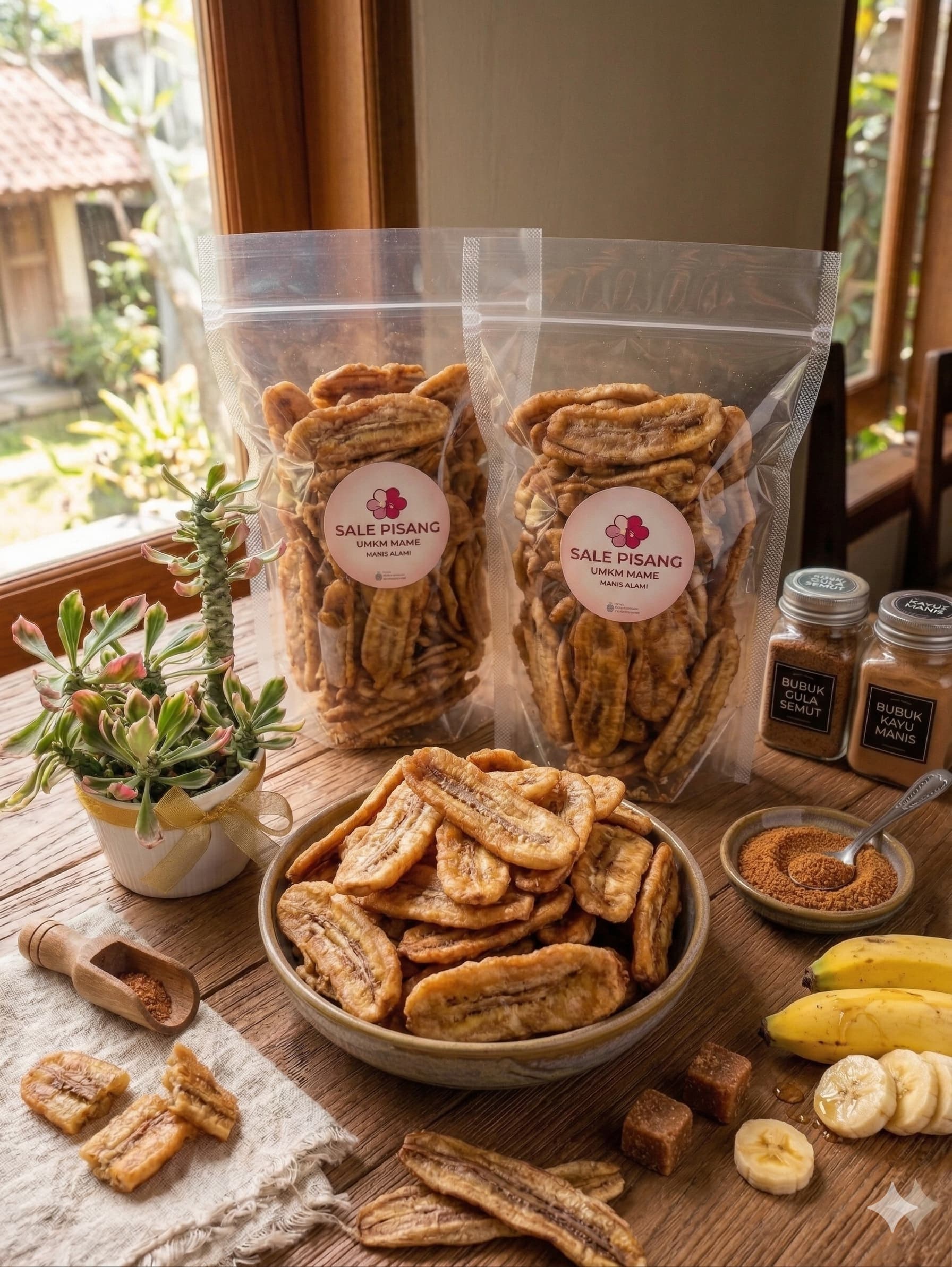 Pisang ambon pilihan yang dikeringkan alami. Manis legitnya asli, dibalut tepung tipis yang super garing.
